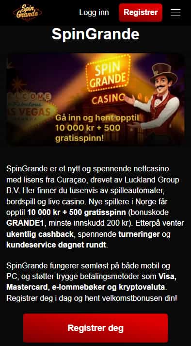 SpinGrande er et nytt og spennende nettcasino med lisens fra Curaçao, drevet av Luckland Group B.V. Her finner du tusenvis av spilleautomater, bordspill og live casino. Nye spillere i Norge får opptil 10 000 kr + 500 gratisspinn (bonuskode GRANDE1, minste innskudd 200 kr). Etterpå venter ukentlig cashback, spennende turneringer og kundeservice døgnet rundt.
