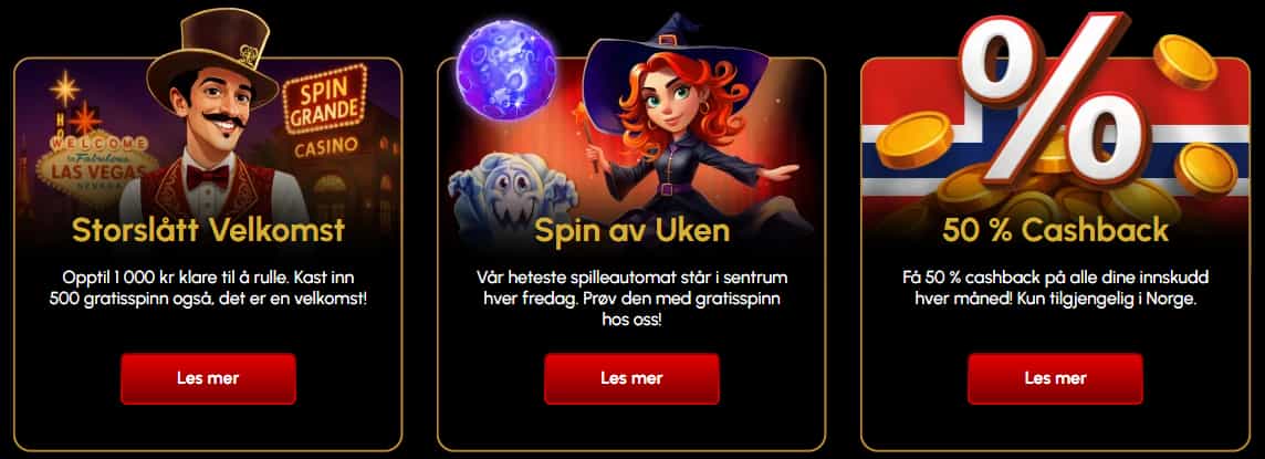 Hos SpinGrande Norge venter det stadig nye kampanjer. I tillegg til velkomstbonusen kan du fÄ ukentlig cashback, reload-bonuser og turneringer med flotte premier. VIP-spillere fÄr eksklusive tilbud, raskere uttak og personlig kundekontakt.